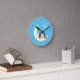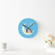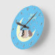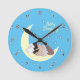 Estrelas brancas bordejadas de preto rodeiam quatro gatinhos adormecidos aninhados em uma lua crescente amarela pálida. Altere o texto, "Bebê Dormindo" para sua própria escolha de palavras para personalizar seu relógio. O fundo azul atual pode ser alterado para outra cor usando o botão Editar Design.