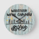 Uma frase engraçada "Que seja, estamos acampando" em um fundo azul rústico de planks de madeira derivada.