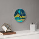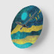 design de paisagem da montanha abstrato em tons de ouro, ciano e azul em tons negros, com um nascer, estrelas e pássaros.