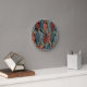 Este relógio de parede tem um design de arte deco de ovais com designs abstratos dentro de cada um em cores retrorativas de rosa e azul.