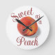 Mostre seu amor pelo verão com este relógio de tema de pêssego. Este design de pêssego doce e veloz apresenta tons quentes e brilhantes de blush, escarlate, âmbar, coral e lilac. Personalize alterando ou removendo o texto. Criei este padrão de uma imagem na minha pintura acrílica original.