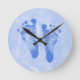 Um menino bonito pegou pegadas em um fundo azul pastel.