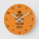 Personalizado Mantenha Calma, grande e colorido relógio laranja redondo. Crie a sua divertida calma e carregar na paródia. As cores de fundo podem ser alteradas. Excelente para parede de cozinha, quarto de estudo, quarto, escritório, empresa, restaurante, compro, hotel, etc. Também disponível em forma grande e quadrada. Cinza ou cor preta da mão.