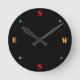 Um relógio preto muito simples com números coloridos estêncilhados.Moderno e moderno este relógio minimalista vai iluminar suas manhãs. Disponível em formas quadradas e redondas.