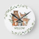 Personalize este relógio de parede de animais únicos da floresta hoje! Basta pressionar o botão personalizá-lo para reorganizar e formatar o estilo e a colocação do texto. Apresentando folhagem verde de aquarela e animais de floresta brancos. Itens correspondentes disponíveis no repositório! c) O Feliz Cat Studio.