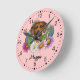 A ilustração original de um desenho animado de um adorável cão Ridgeback da raça Ridgeback, cercado por flores silvestres coloridas do verão. Há uma flor rosa escamoteada, uma flor roxa, uma flor rosa escura e uma flor margarida branca junto com algumas folhas e galhos verdes. A cor de fundo é cor-de-rosa com um padrão de bolinhas leve. A cor de fundo pode ser alterada para qualquer outra cor e o padrão de bolinhas pode ser removido, se desejado. As horas são marcadas com números. As horas e os minutos são mostrados com uma face pontilhada do relógio. Há também uma área de texto personalizável para um nome ou outro texto personalizado em uma fonte de script adorável.
