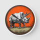 Representação estilizada de um rinoceronte apresentado em formato circular. O rinoceronte é exibido numa pose dinâmica, mostrando sua proeminente buzina e seu corpo robusto. O fundo é uma cor laranja vívida, que contrasta com as bordas pretas do círculo, criando um efeito visual impressionante. O chão debaixo do rinoceronte é ilustrado com detalhes sutis, parecendo uma paisagem texturizada. Ao redor do rinoceronte estão arbustos espinhosos ou vegetação estilizada. O estilo geral combina realismo com talento artístico, produzindo uma composição atraente e impactante.