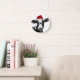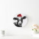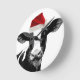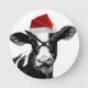 Close up photograph of a black and white cow in black and white... with a bright red christmas santa hat on its head! Perfect for dairy farmers and livestock businesses.