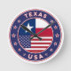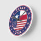 Crachá do Texas com bandeira do Texas e bandeira dos EUA, cores, forma arredondada. Emblema do Texas. Selo do Texas. Coleção dos Estados Unidos.