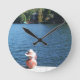 Relógio Redondo Vermelho, Branco, Azul: Menino sentado em meia com