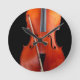Violoncelo de madeira clássico com um arco contra um fundo preto.