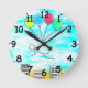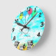 Personagem de desenho animado usando balões para voar sobre a cidade. Imagem digital colorida. Esta versão do relógio da parede tem um discagem.