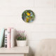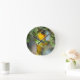 Relógio de parede com uma imagem engraçada de um pássaro amarelo construindo um ninho.