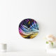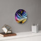 This wall clock, has a colorful design of feathered brush strokes in a slight butterfly design.
