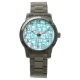 Este relógio feminino tem uma design moderna do século médio de retângulos abertos em azul sobre retângulos abertos em azul-ovo de robin.