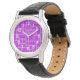 Este relógio tem um design de Bauhaus de retângulos feitos com linhas de cinza num campo de roxo.