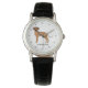 A ilustração original do desenho animado de Destei de um cão Ridgeback da raça Ridgeback. Há também uma área de texto personalizável para um nome ou outro texto personalizado. A face do relógio é feita de linhas pretas simples.