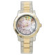 O rosto do relógio apresenta um padrão cor-de-rosa da concha do abalone que é digitalmente rendido em pastel. Números pretos, quadro e detalhes adicionam contraste além do fazer, é fácil saber o tempo.