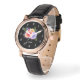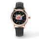 Um relógio monográfico personalizado, com um buquê agradável de rosas de aquarelas, com ranhuras, folhas e galhos, todos juntos num arranjo floral colorido. Fundo preto.