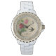 ilustração prévia monograma, rosa de vintage, pássaro/libélula de andorinha voadora, relógios femininos, buquê de rosas/flores, rosas vintage vermelhas e rosa, modelo de três letras monograma, personalizar texto marrom, fonte guião, design floral feminino/chic/elegante, rosas antiquados/antigos, colagem digital simples/romântica, fundo manuscrito estilo de idade/aparência/inspiração, época vitoriana dos anos 1800, arte alterada vintage, fundo creme, flor de rosa, flor de rosa, imagem vintage de flores misturadas, aparência texturizada. Monogrammed observa as mulheres, pela red_dress, apresentando uma colagem digital de buquê romântico de rosas vermelhas e cor-de-rosa, uma ave andorinha voadora e libélula, com um modelo de texto para as suas iniciais de três letras monográficas (tipo de letra, em castanho). O buquê das flores é impresso sobre um fundo manuscrito, formando um padrão texturizado e absurdo, em tons de bege. Personalize facilmente os relógios de estilo vintage para as mulheres, com as suas iniciais de monograma. Vintage alterou a arte (antigo design floral) digitalmente criada por red_dress, usando imagens antigas, a partir dos anos 1800, de rosas antiquados.