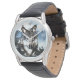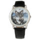 Lobo, ou lobo-de-relva, rodeado sobre um fundo de montanha nevada com o fundo mostrando através de partes da face do lobo para criar um único relógio de pulso