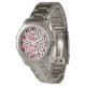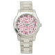 Este relógio feminino tem um padrão repetitivo de ovais em roxo retrô com ovais brancos espalhados em um campo de branco.