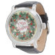 Este elegante relógio de Natal apresenta uma luxuosa coroa de Natal sobre um fundo de ouro leve moderno. A coroa é decorada com cones de pínus, bolas de vidro, ruivos, vermelhos e brancos, estrelas de ouro e flocos de neve. Os números do relógio vermelho estão escondidos atrás da coroa, mas visíveis. Muito feliz decoro com o texto Feliz Natal. Feliz Natal!