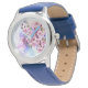 Articulação artificial, ramo de cor-de-rosa, cereja floresce sobre fundo picturesco, texturizado, pintado com tinta branca, rosa e azul. Pink Sakura