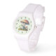 Um relógio com uma ilustração legal. Com um sapo verde sentado num monte de grama. Um grande cogumelo vermelho abrigando-o dos elementos. Um par de cogumelos pequenos por perto.