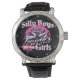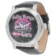 This empowering wall clock makes a playful yet powerful statement about women in trucking. Against a black background with a pink rim, it features a purple semi-truck and the bold text: "Silly Boys Trucks Are For Girls". It's an ideal gift for any female truck driver who takes pride in breaking stereotypes. The design tool can also be used to add custom text if you want your name or company on this clock. You can customize the color of the frame to any color you desire by going into the design tool.