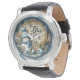 This image features a Snowman Let It Snow Blue Watch with a charming, rustic winter scene. The central design displays a smiling snowman wearing a blue striped hat and scarf. The background is a vertical wood plank sign that reads "let it snow". The scene includes various elements of winter foliage, blue berries, pine needles, and large snowflakes. The watch face is surrounded by a decorative border of blue, white, and tan stripes. The overall color palette is dominated by various shades of blue and brown.