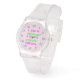 As mulheres ou senhoras assistem às leituras, em letras verdes brilhantes e pastéis, EU SOU UM SOLDADO NO EXÉRCITO DA RESISTÊNCIA PACÍFICA. O relógio tem rosto rosa pálido e números romanos azuis. Você pode escolher entre uma variedade de estilos de relógio, incluindo alguns para crianças e homens.