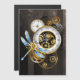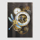 Marcações antigas com engrenagens de ouro e latão, decoradas com libélula mecânica sobre fundo castanho e listrado. Steampunk.