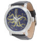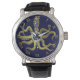 Este monstro-do-mar-boi tentado tem oito apêndices de ouro tipo arame, uma engrenagem prateada central e muitas engrenagens e pinos fazeres para cima da cabeça, olhos e xícaras de sução. É um polvo robô / kraken, um monstro da máquina de metal para qualquer um que goste de geek ficção científica / criaturas fantasias. Neste relógio, há também algarismos romanos dourados para manter o tempo. A cor de fundo azul é personalizável.