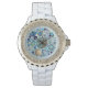Rinostone White Enamel eWatch, com uma imagem de lindas pedras de gema, conchas e uma sereia ouro em azul claro. Veja a coleção inteira de Gemstones & Medallions Watch na seção ACESSORIES.