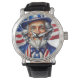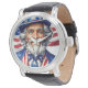 Tio sorridente Sam USA American Icon vestindo um terno americano e uma bandeira americana balançando ao fundo