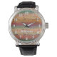 Este é um design excelente para pescadores de mosca com um padrão listrado e espetado que se parece com a pele da truta arco-íris. É fácil ler números em branco com uma sombra em branco e um nome de exemplo segurando o lugar para você adicionar o seu em uma fonte legal em apuros. #rainbowtrut #flyfish #pescadores #wristwatch #vintage #retro #personalizado #esportista #watersport