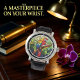 Bring the vibrant allure of the tropics into your home with this stunning decorative wall clock, showcasing a colorful parrot in a captivating stained-glass style design. The artistic clock face features a close-up of the exotic bird, its plumage bursting with brilliant colors and set against lush green foliage, creating a unique and intricate work of art. This functional timepiece is more than a way to tell time; it's a beautiful piece of nature-inspired wall art that transforms any room into a tropical sanctuary. Perfect for bird lovers, its handmade look and vibrant design exemplify creative craftsmanship, adding an ornate and stylish focal point to your home decor.