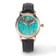 Um relógio com uma bela fotografia. Palmeiras altas com troncos longos e finos em frente a um lindo céu verde. Esquema de cor retrorativa. Relaxando e relaxando.