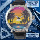 This round wall clock features a breathtaking tropical sunset scene. Silhouetted palm trees frame a vibrant sky ablaze with fiery oranges, yellows, and deep pinks, casting a warm glow over tranquil blue waters. The clock has clear white numerals and black hands, making it a functional art piece. It's perfect for adding a serene, vacation-like ambiance to any room.