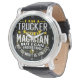 This witty wall clock features a humorous and relatable statement from a truck driver. Against a black background with a yellow rim, it displays the bold text: "I AM A TRUCKER NOT A MAGICIAN BUT I CAN UNDERSTAND WHY YOU MIGHT BE CONFUSED". This clever design, accented with yellow stars, is a perfect gift for any trucker who deals with misperceptions about their job. The design tool can also be used to add custom text if you want your name or company on this clock. You can customize the color of the frame to any color you desire by going into the design tool.