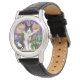 Um gato branco e preto, bicolorado, o Shorthair europeu, sentado numa cadeira de madeira em frente às flores violetas do jardim. Foto de Katho Menden. Este relógio é uma ideia de presente para amantes de gatos.