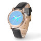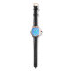 Este relógio incrível apresenta uma imagem de arte digital de um unicórnio bebê menino azul mágico fofo. O corpo principal do unicórnio é azul e a crina e a cauda são duas tonalidades diferentes de azul. O unicórnio tem cascos dourados e um chifre dourado brilhante no topo da cabeça. Ele tem um olho em forma de diamante azul. O unicórnio tem um grande sorriso no rosto.