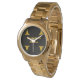 Stylish unisex large-style gold wristwatch with stainless steel case and band. 1.24" dial, 1.57" case, and 8.5" x 0.82" strap. Japan Quartz® 3-hand analog movement with full-color custom dial. Butterfly clasp. Hand-dyed in Canada. Keep or Change Phrase.