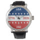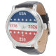 Celebrating the USA's 250th anniversary. The red, white, and blue watch has the word 'USA' at the top (instead of 12). The year 1776 is in the place of 9 and the year 2026 is in the place of 3. 250 is at the bottom instead of 6. The top stripe is blue and has white stars. The center stripe is white. The bottom stripe is red with white stars.
