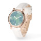 Este deslumbrante eWatch tem um fundo verde-claro com medalhões azuis e verdes espalhados pela borda. Os números são grandes e brancos. A banda também é de couro branco. Estes medalhões vêm de padrões azulejos do azulejo de Oregon Fay Jones Day.