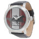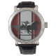 Vermelho profundo com dois gangues com tiras de corrida no relógio de pulseiras pretas masculinas. Excelente presente de aniversário para aquele amante de Mustang/Procure por nossos Carros Mats e outros Produtos Mustang. A "Vintage Leather Watch" dos Homens é um grande pedaço de tempo que nunca sairá do estilo. Com um movimento de quartzo em três mãos e uma verdadeira precinta de couro, o aspecto clássico deste relógio é excelente para ocasiões formais e divertidas. Personalize o rosto com seu nome e designs para que um relógio corresponda perfeitamente à sua personalidade e estilo. Assistentes de pulso masculino Material: Face: Liga