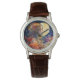 Um relógio vibrante com uma pintura aquosa de uma garota e lua.