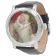 Um belo relógio de vintage com Papai Noel com um brinquedo e vergreens.