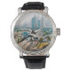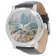 Relógio Visão da linha de metrô da cidade e arranha-céus